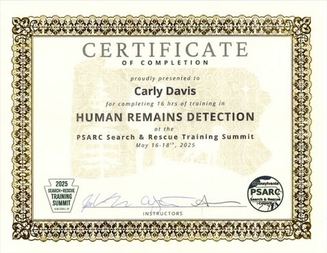 Karoo and Carly continue to learn with North Western Pennsylvania Search And Rescue. All of the hard work at protocol blocks is paying off and Karoo worked an entire acre area to find a buried source in September 2025. Below you see Karoo enjoying a game of tug as her reward.